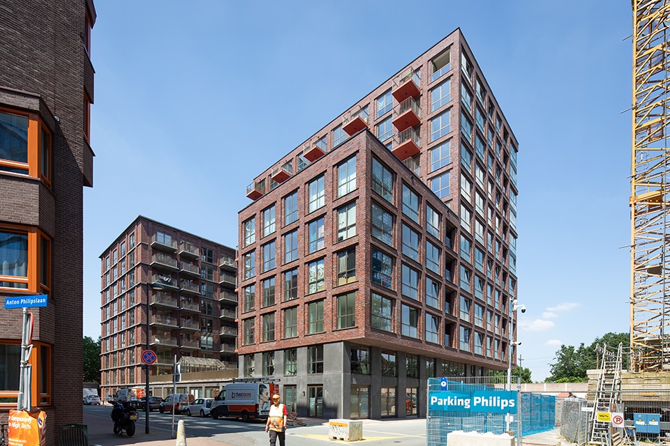 Drie blokken in verschillende hoogtes tussen de vier en negen lagen vormen een mooie mix van koop- en huurappartementen. Ga je de hoek om, dan zie je daar vier opvallende grondgebonden woningen die de aansluiting maken tot de Strijpse buurt Philipsdorp. De groene gevel van keramische tegels wijkt duidelijk af van de rest van de bebouwing. Steijlen: “De drielaagse woningen met sheddaken refereren naar het industriële verleden van Eindhoven. De licht- en donkergroene belijning vormt een barcode en verwijst naar de digitale samenleving. In combinatie met de gouden kozijnen vallen de woningen