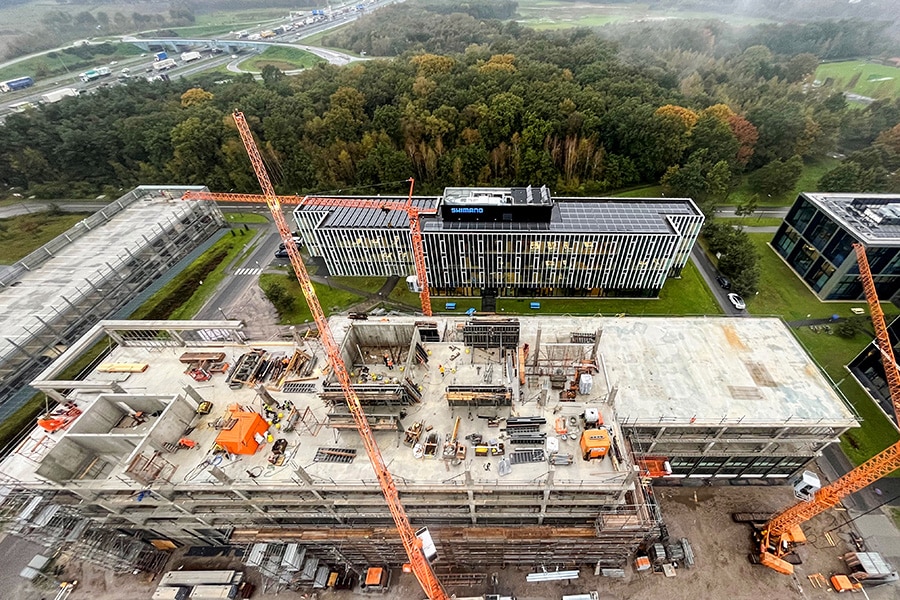 De wanden, kolommen en balken zijn volledig in het werk gestort door de eigen specialisten van Bouwbedrijf van de Ven. “Waar de wanden op de verdiepingen in situ zijn gestort, zijn de balken en kolommen op maaiveldniveau geproduceerd, op een prefab straat die op de bouwplaats is gerealiseerd”, vertelt Schuijers. “Vervolgens zijn zij met eigen mensen en materieel naar de juiste verdiepingen gebracht en gemonteerd.”