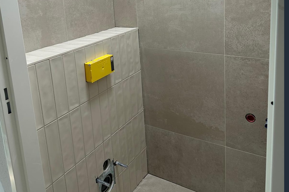 Vaak worden koopwoningen casco opgeleverd, waarna de eigenaars er zelf mee aan de slag gaan. Dit was bij Groot Hartje niet het geval, omdat het om hoogbouw gaat en alles ook waterdicht afgeleverd diende te worden. Dit gebeurde onder meer met hoogwaardige tegellijmen en waterdichtingsmiddelen van de firma Schomburg. Maik Stam leverde met zijn team het complete tegelwerk van A tot Z, voor zowel de koop- als de huurwoningen. “Voor de huurwoningen waren standaard witte tegels en donkere vloertegels geselecteerd. De eigenaars van de koopwoningen mochten zelf tegels uitzoeken bij groothandel BMN in Best. Daarmee zijn wij vervolgens aan de slag gegaan. Zoals het gemaakt moest worden volgens het showroomrapport, voerden wij het uit”, vertelt Stam.